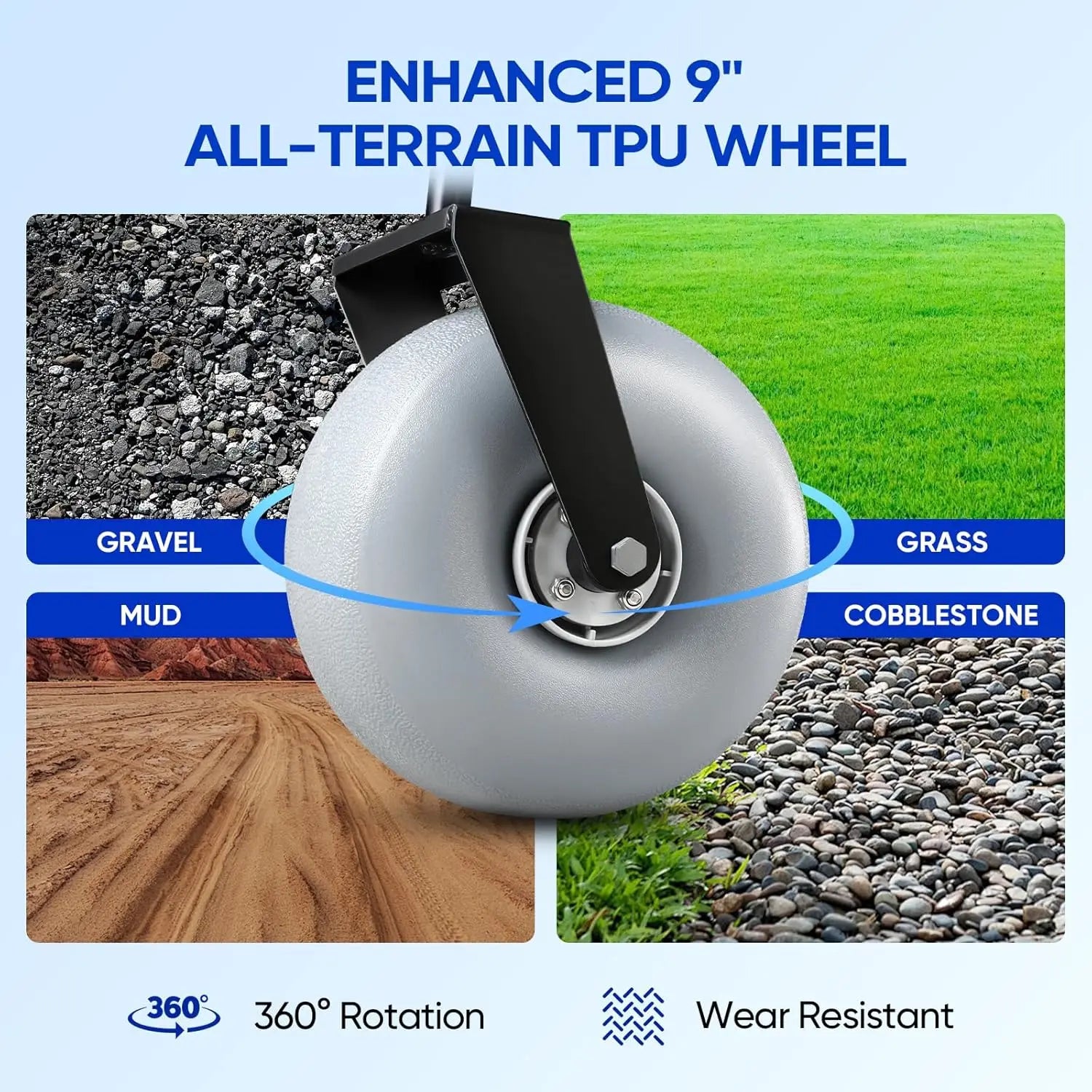 - 9-inch all-terrain balloon wheels glide smoothly over sand, gravel, and grass; 360° rotation makes steering effortless, and a portable air pump inflates to 4–5 PSI for optimum performance.